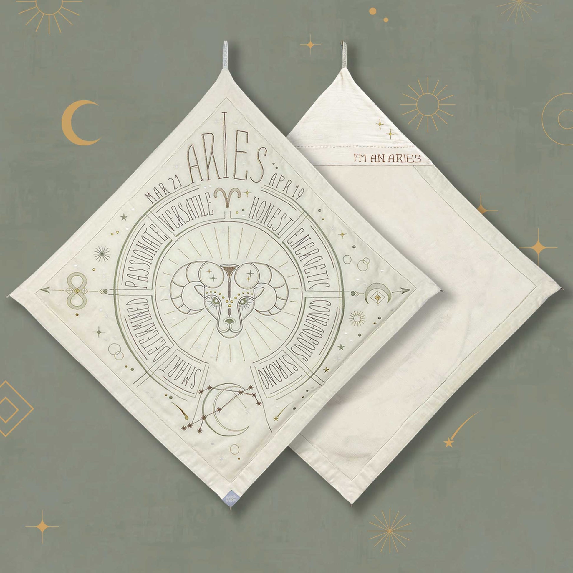 Wrap your little loved one in this Sacred Birth Cape. An beautifully embroidered bath cape with the star sign of the little one, shows the position of the stars and personal characteristics. The shape, colors, materials and symbols have the potential to rise the energy of your sacred zodiac spirit. The unique “glow in the dark” effect will give you a magical experience in the night. A timeless gift to be treasured a lifelong. Use it as a bath cape or as a decoration on your wall, made of 100% super soft cotton.