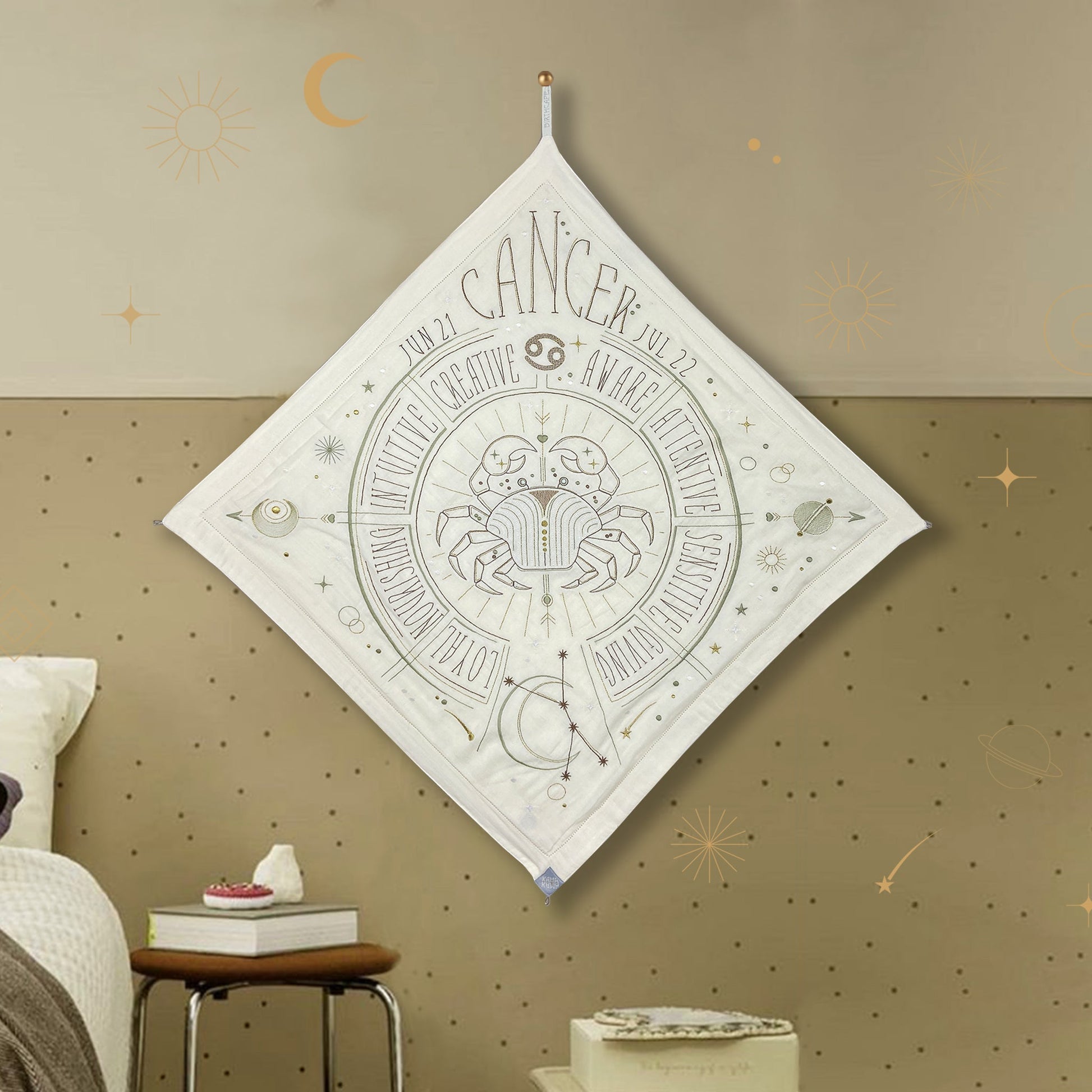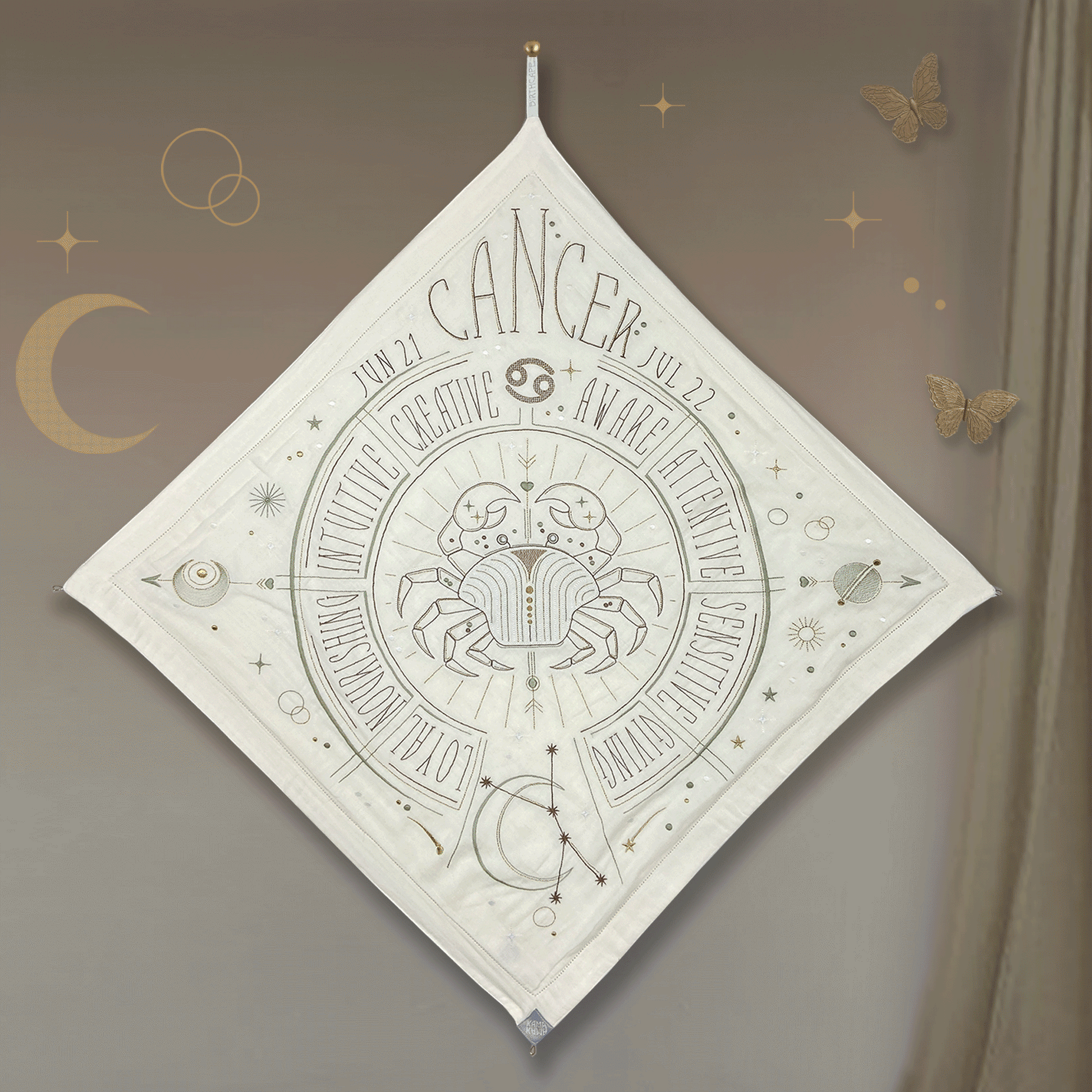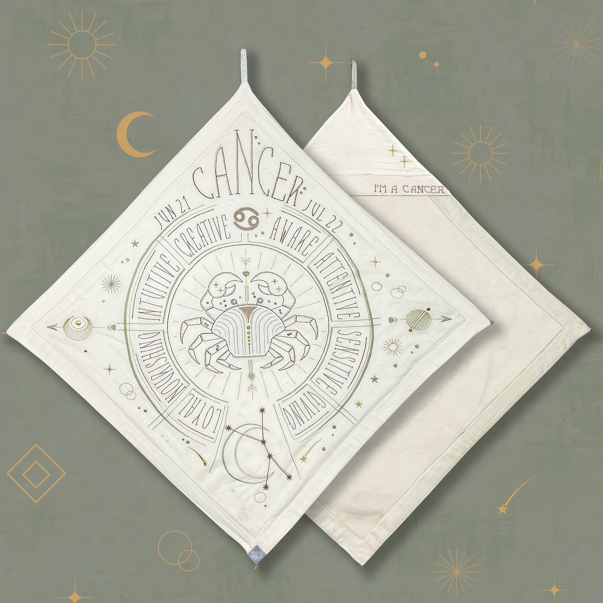 Wrap your little loved one in this Sacred Birth Cape. An beautifully embroidered bath cape with the star sign of the little one, shows the position of the stars and personal characteristics. The shape, colors, materials and symbols have the potential to rise the energy of your sacred zodiac spirit. The unique “glow in the dark” effect will give you a magical experience in the night. A timeless gift to be treasured a lifelong. Use it as a bath cape or as a decoration on your wall, made of 100% super soft cotton.