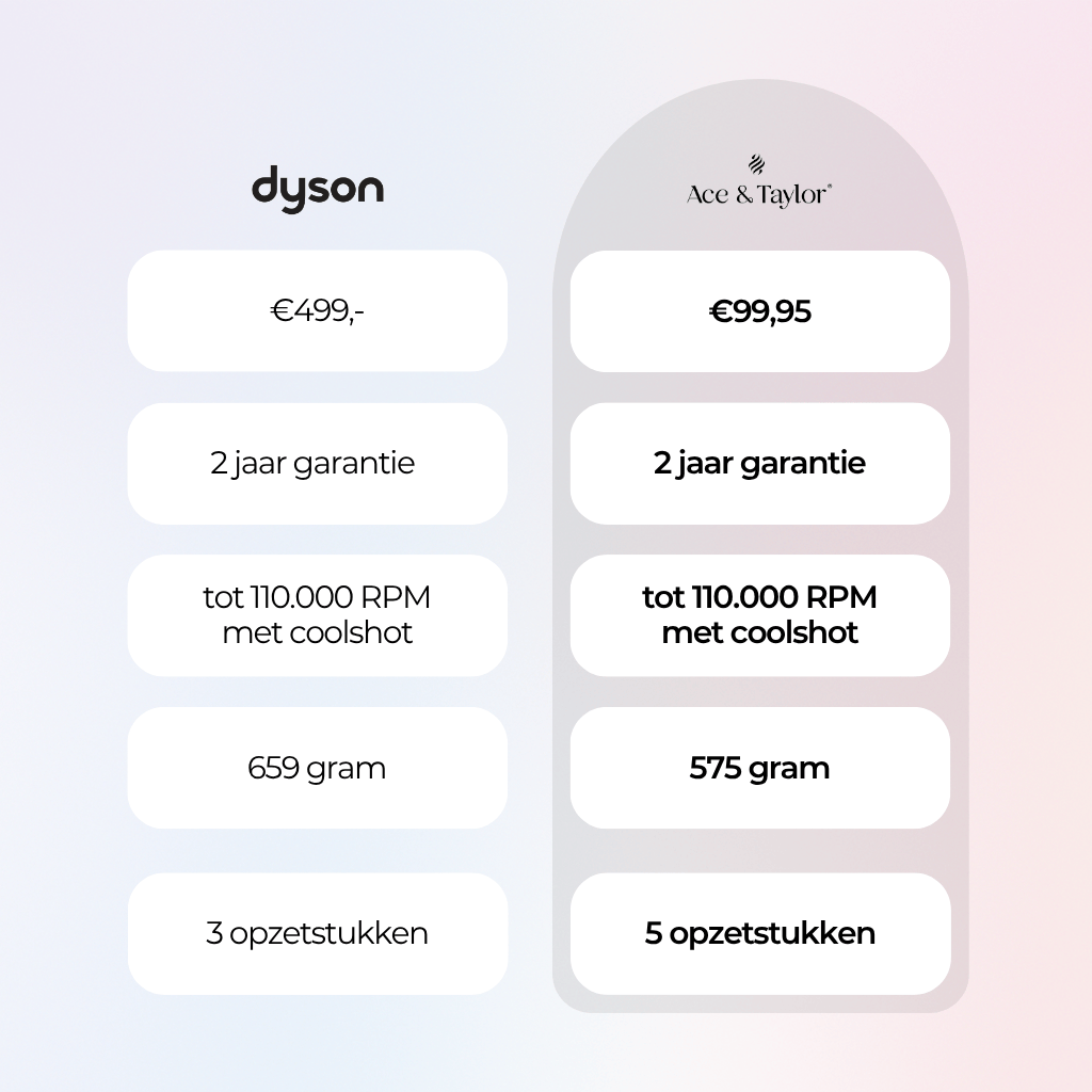 - Vijf opzetstukken inbegrepen concentrator diffuser smalle diffuser smooth air en flyaway voor veelzijdige styling
