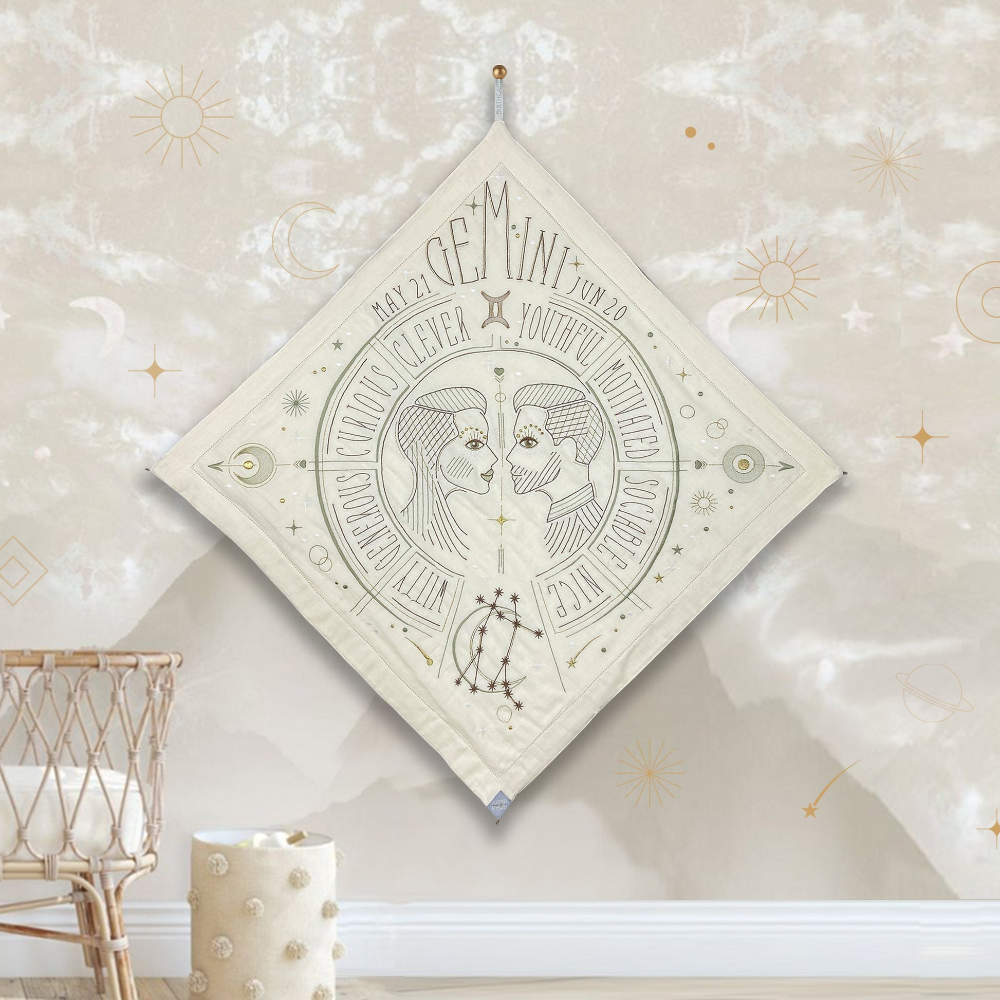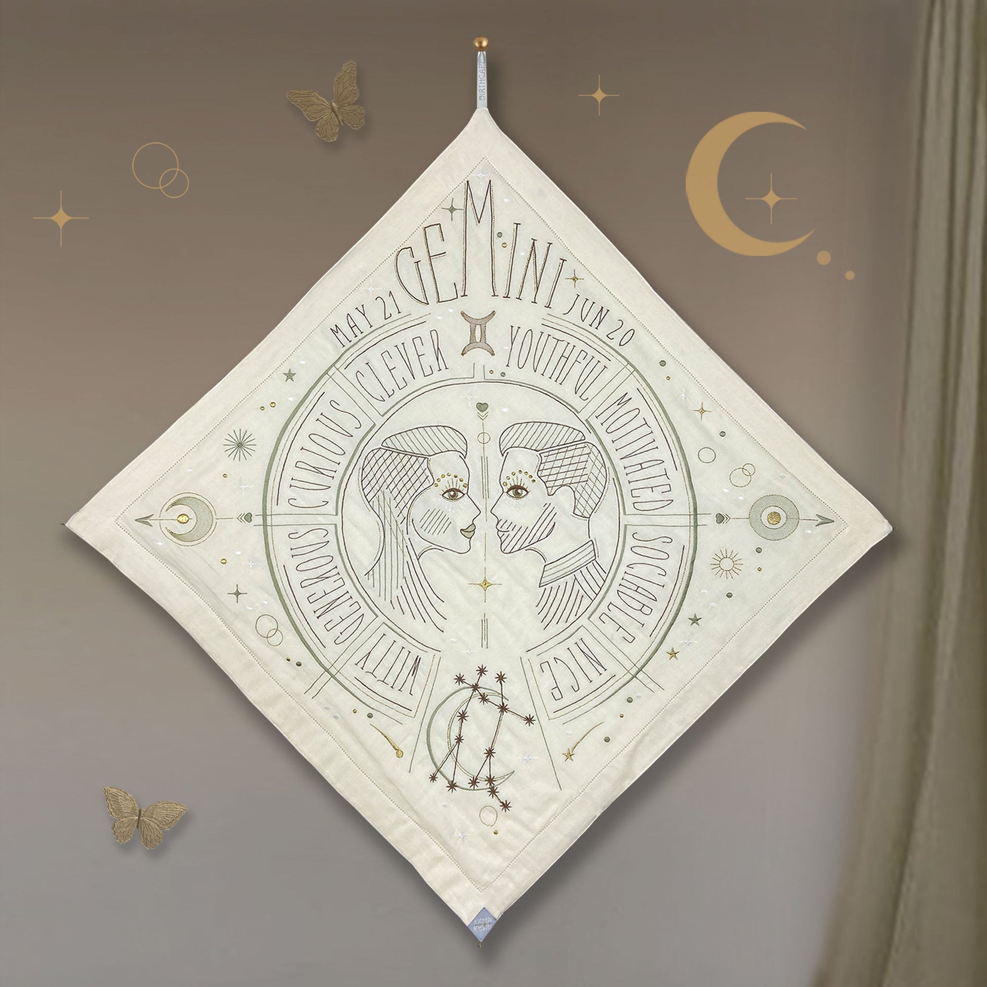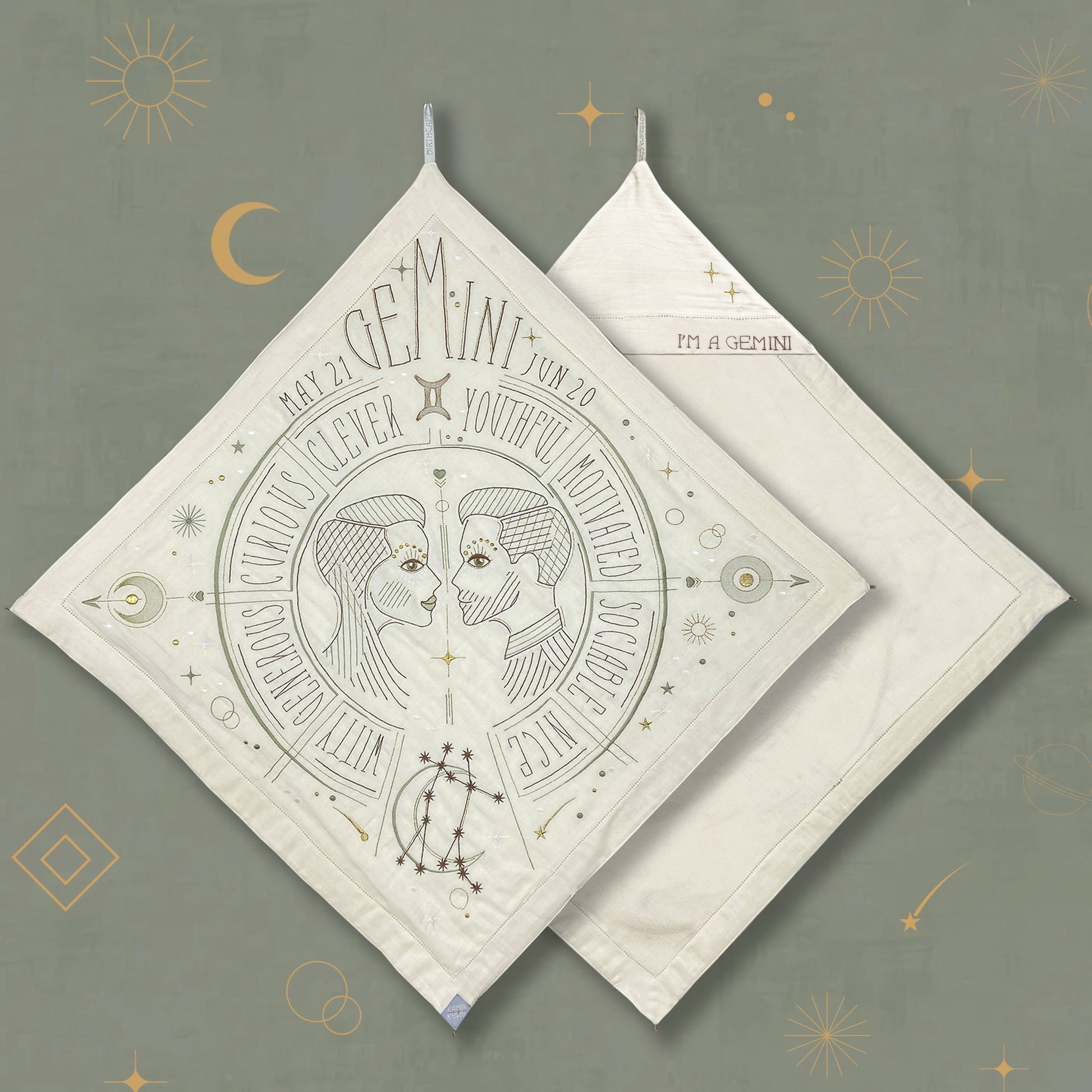 Wrap your little loved one in this Sacred Birth Cape. An beautifully embroidered bath cape with the star sign of the little one, shows the position of the stars and personal characteristics. The shape, colors, materials and symbols have the potential to rise the energy of your sacred zodiac spirit. The unique “glow in the dark” effect will give you a magical experience in the night. A timeless gift to be treasured a lifelong. Use it as a bath cape or as a decoration on your wall, made of 100% super soft cotton.