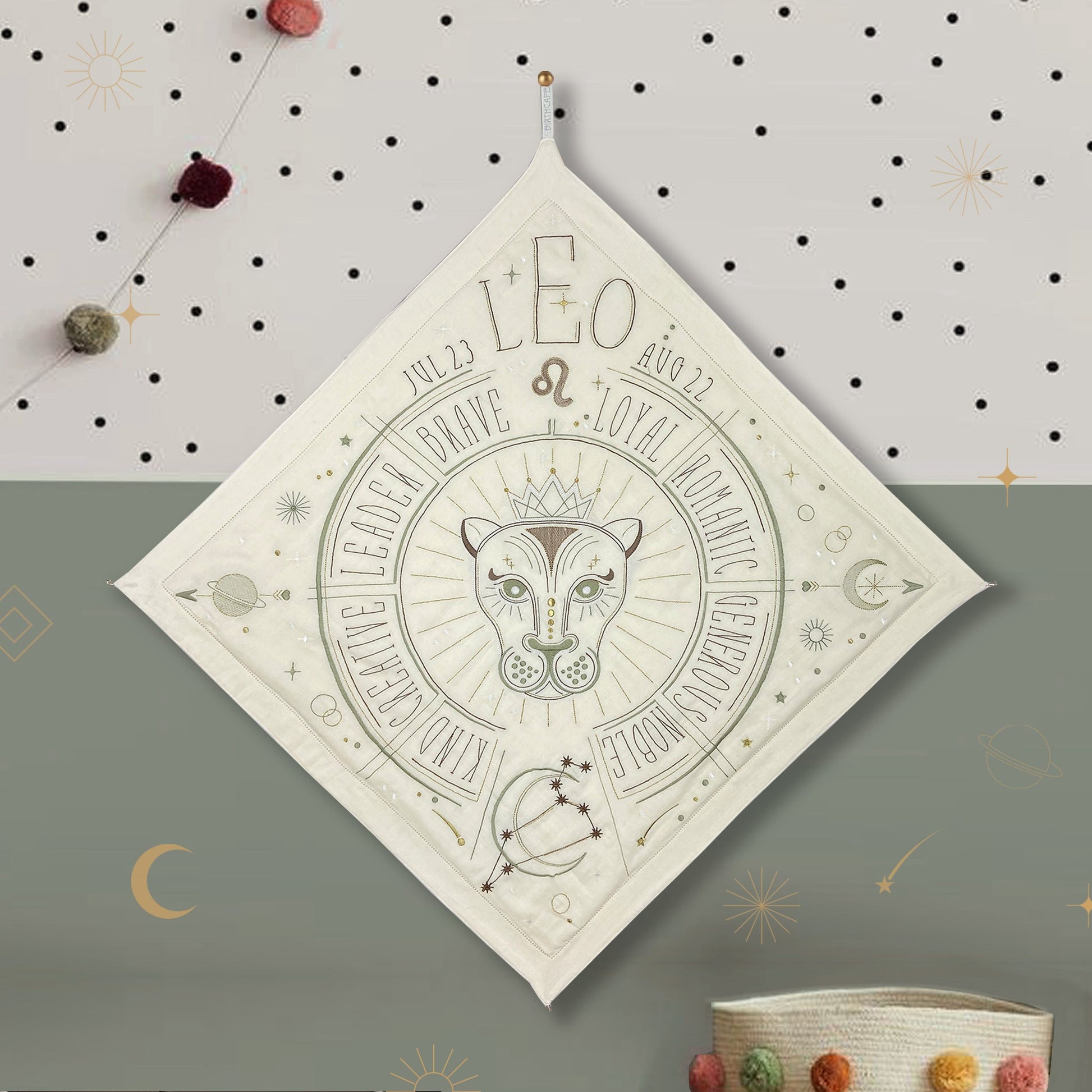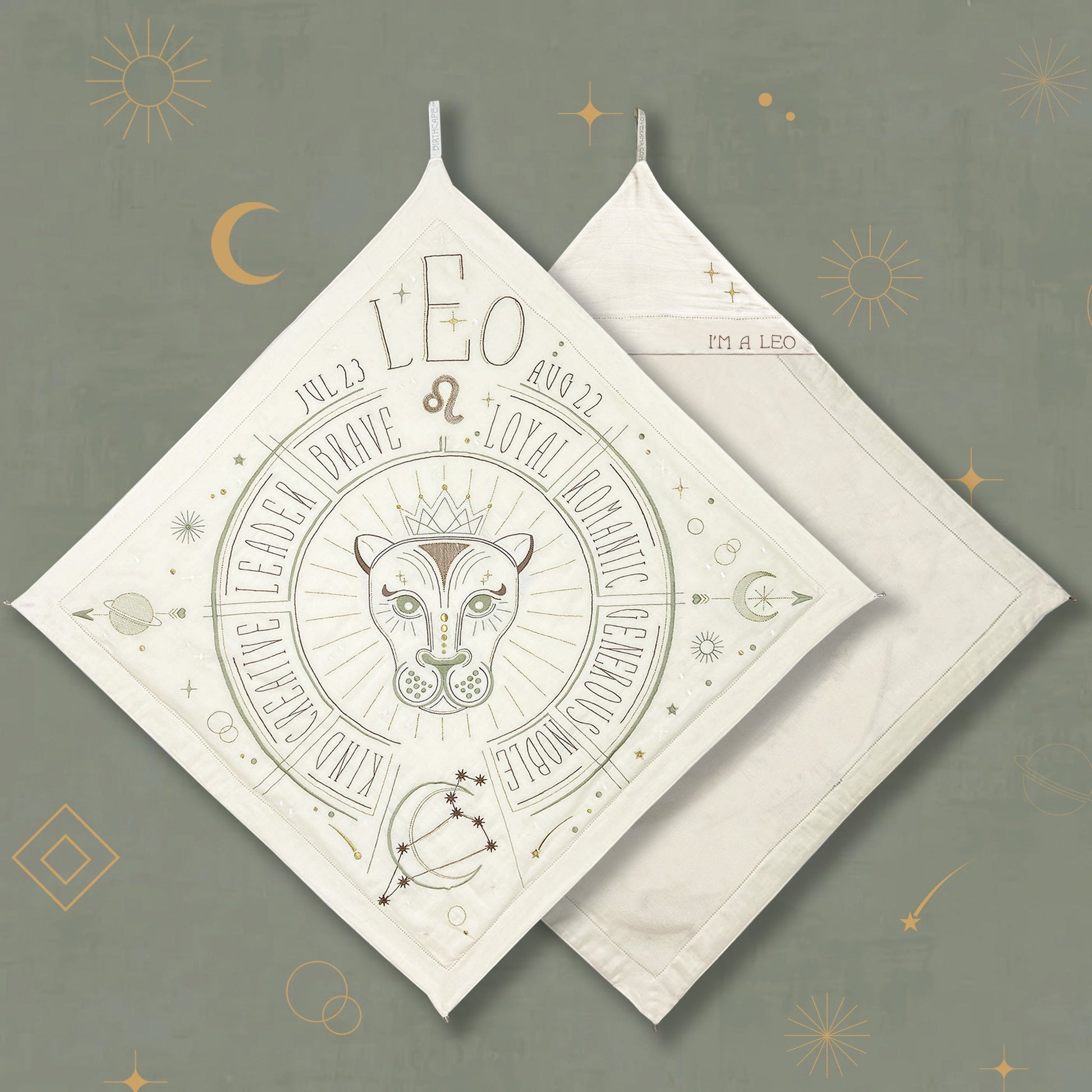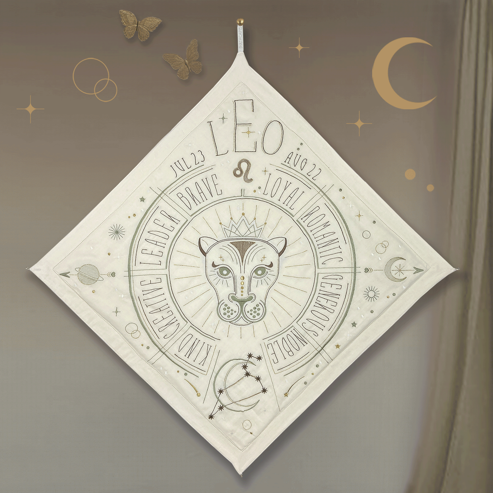 Wrap your little loved one in this Sacred Birth Cape. An beautifully embroidered bath cape with the star sign of the little one, shows the position of the stars and personal characteristics. The shape, colors, materials and symbols have the potential to rise the energy of your sacred zodiac spirit. The unique “glow in the dark” effect will give you a magical experience in the night. A timeless gift to be treasured a lifelong. Use it as a bath cape or as a decoration on your wall, made of 100% super soft cotton.