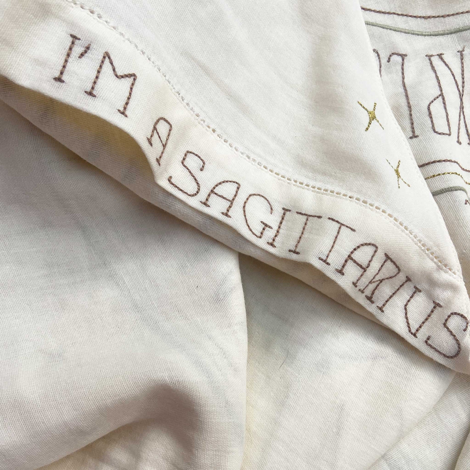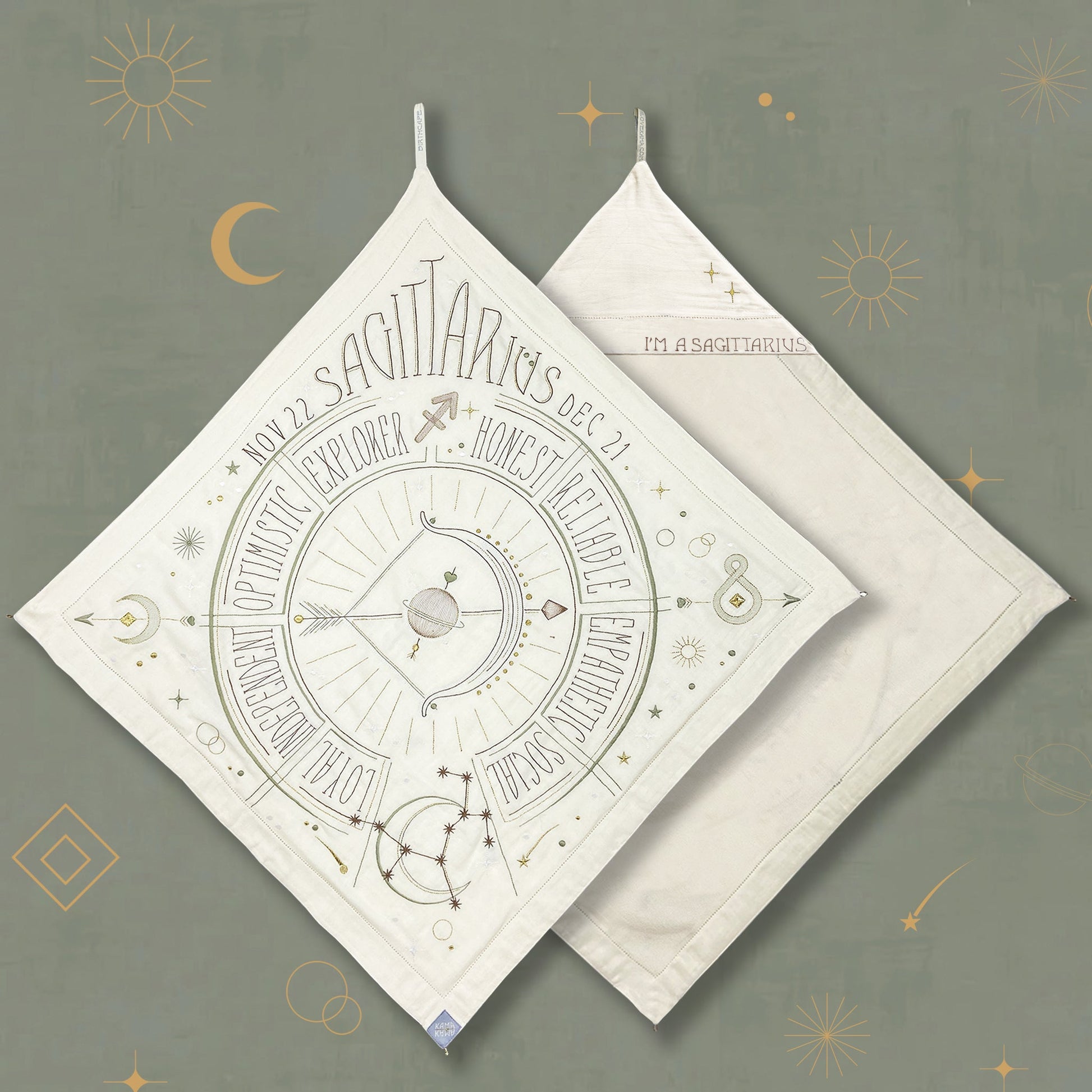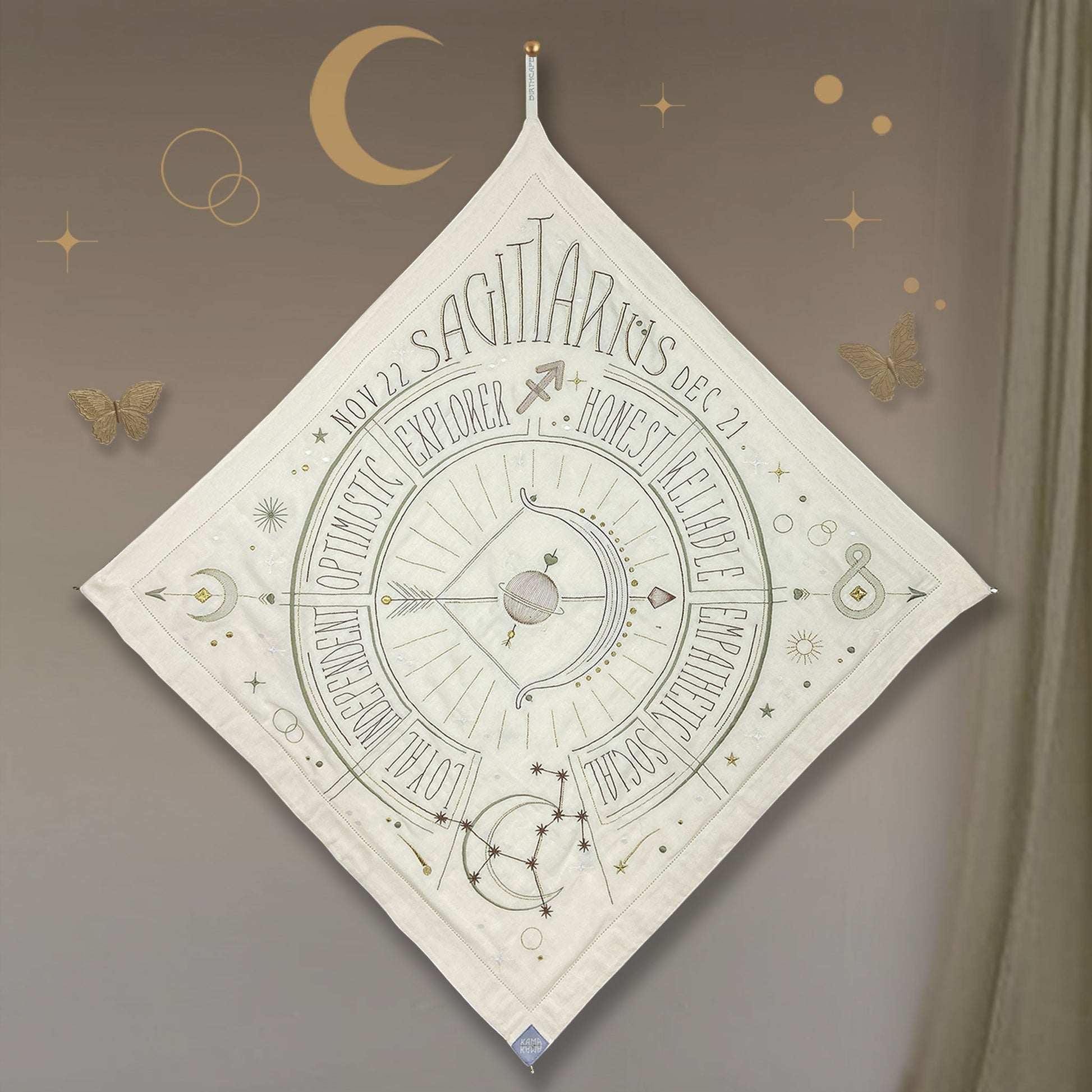 Wrap your little loved one in this Sacred Birth Cape. An beautifully embroidered bath cape with the star sign of the little one, shows the position of the stars and personal characteristics. The shape, colors, materials and symbols have the potential to rise the energy of your sacred zodiac spirit. The unique “glow in the dark” effect will give you a magical experience in the night. A timeless gift to be treasured a lifelong. Use it as a bath cape or as a decoration on your wall, made of 100% super soft cotton.